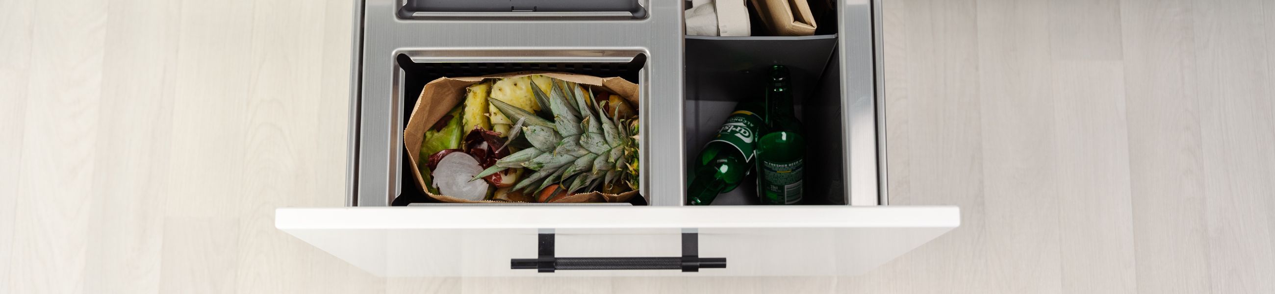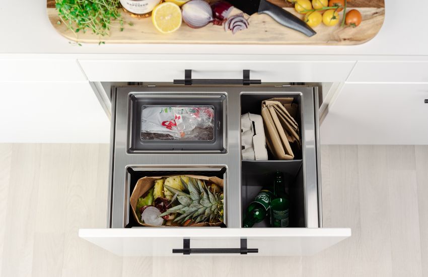 Behälter: Mülltrennungssysteme verfügen über mehrere separate Fächer oder Behälter, um die Sortierung verschiedener Abfallarten wie Kunststoff, Papier, Metall und Bioabfall zu erleichtern. Jeder Behälter ist mit praktischen Griffen ausgestattet, sodass er sich bei Bedarf einfach herausnehmen, transportieren und entleeren lässt. Diese durchdachte Funktionalität verbindet Komfort mit effizienter Mülltrennung und ermöglicht eine übersichtliche Organisation des Abfalls.