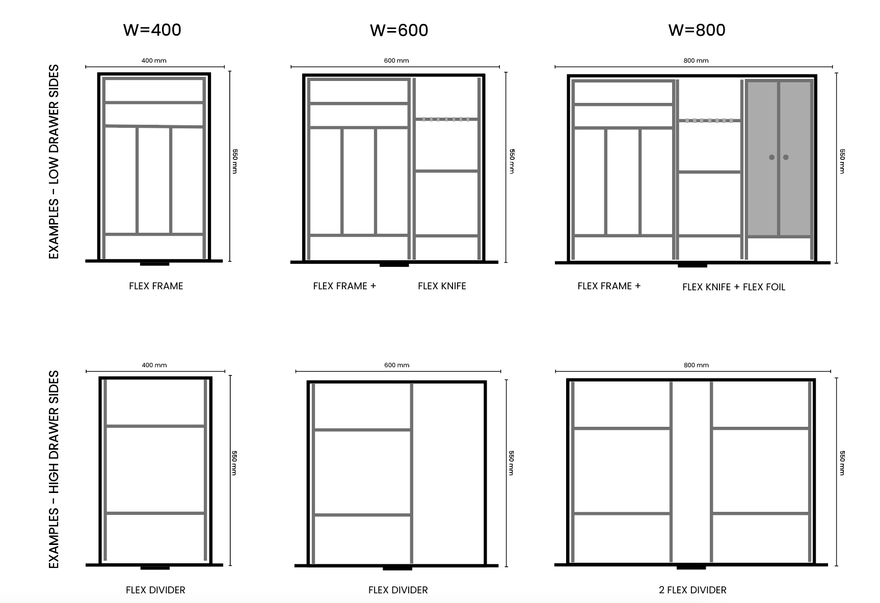 Die Flex Basic Besteckschublade ist eine intelligente und flexible Serie von Besteckschubladen und Einsätzen, die in die meisten Schubladen passen, z. B. von Blum Tandembox, Legrabox und Grass Vionaro. Der Einsatz lässt sich einfach in der Schublade verschieben und die Trennwände können individuell angepasst werden, um eine optimale Aufbewahrung in der Küche zu gewährleisten. Die Besteckschublade verfügt außerdem über eine abnehmbare Fronthalterung und passt somit auch in andere Schubladen. Kombinieren Sie die Besteckschublade mit praktischem Zubehör wie Einsätzen für Messer, Gewürze und Alufolie. Mit unserer intelligenten Besteckschublade behalten Sie Ihre Schubladen stets im Möbelgriff und optimieren Ihre Arbeitsabläufe in der Küche.