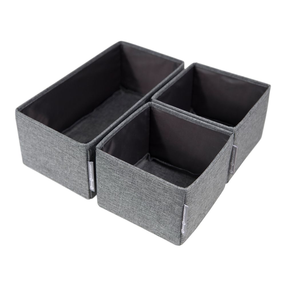 Diese praktische Aufbewahrungslösung besteht aus drei Teilen: einer größeren und zwei kleineren Schubladen. Sie eignet sich perfekt, um alles von Unterwäsche und Socken bis hin zu Accessoires und Kleinteilen zu organisieren. Das Set ist in einem sanften Grauton gehalten, der sich harmonisch in die meisten Wohnungen und Kleiderschränke einfügt.