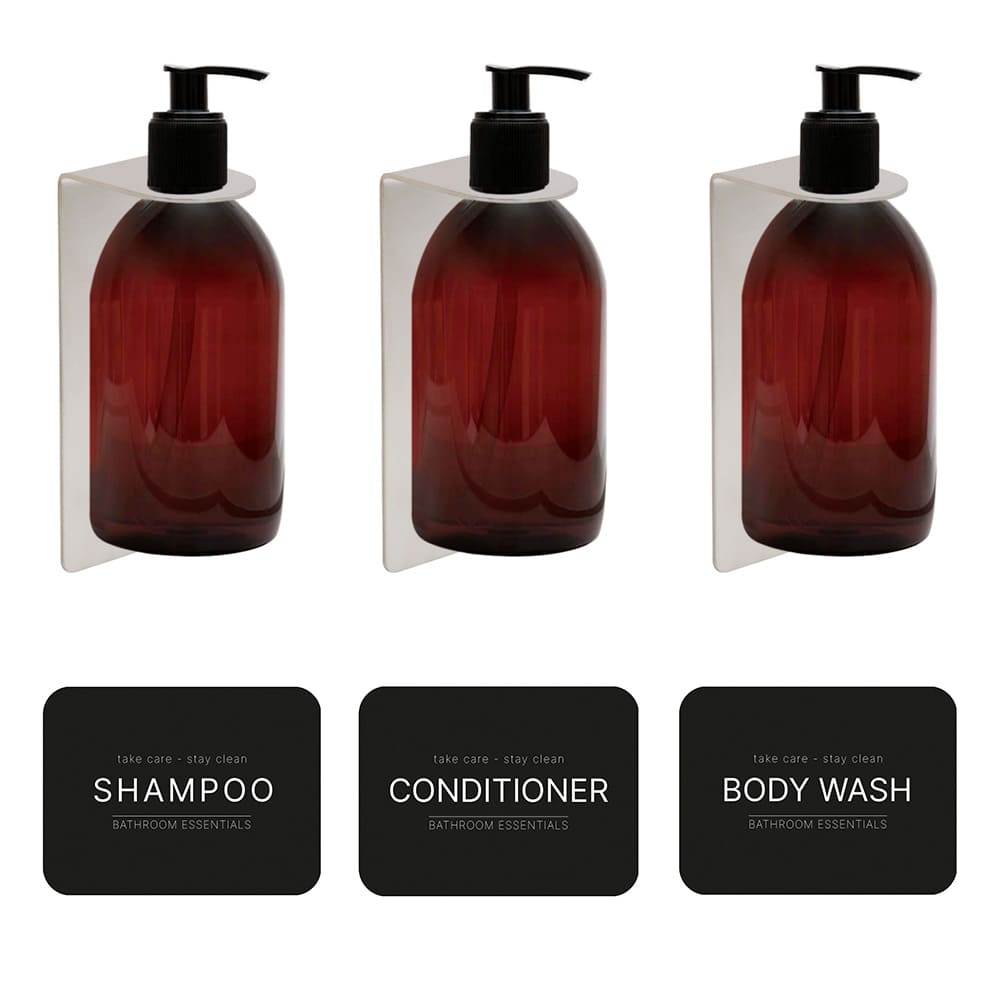 Die Seifenspender sind mit drei braunen Seifenspendern in modernem und stilvollem Design ausgestattet. Die Pumpenköpfe sind benutzerfreundlich und sorgen für eine gleichmäßige Dosierung. Für noch mehr Übersichtlichkeit sind die Flaschen mit den Aufschriften „Shampoo“, „Conditioner“ und „Duschgel“ beschriftet. So finden Sie schnell das richtige Produkt und schaffen gleichzeitig ein einheitliches und elegantes Gesamtbild. Mit diesem Set erhalten Sie nicht nur praktischen Stauraum in der Dusche, sondern auch eine ästhetisch ansprechende Lösung, die sich einfach installieren und pflegen lässt.