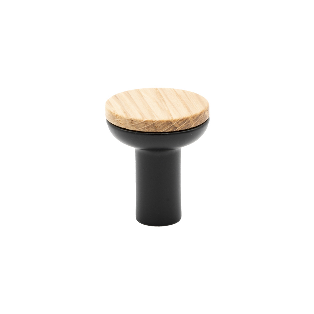Der Knopp Bis wurde entworfen, um den Kontrast zwischen dem schwarzen Sockel und der warmen, weichen Holzfront hervorzuheben. Eine perfekte Materialkombination, die einen markanten möbelknopf schafft. Der schwarze Sockel sorgt für Stabilität, während die warme, weiche Holzfront einladend wirkt.