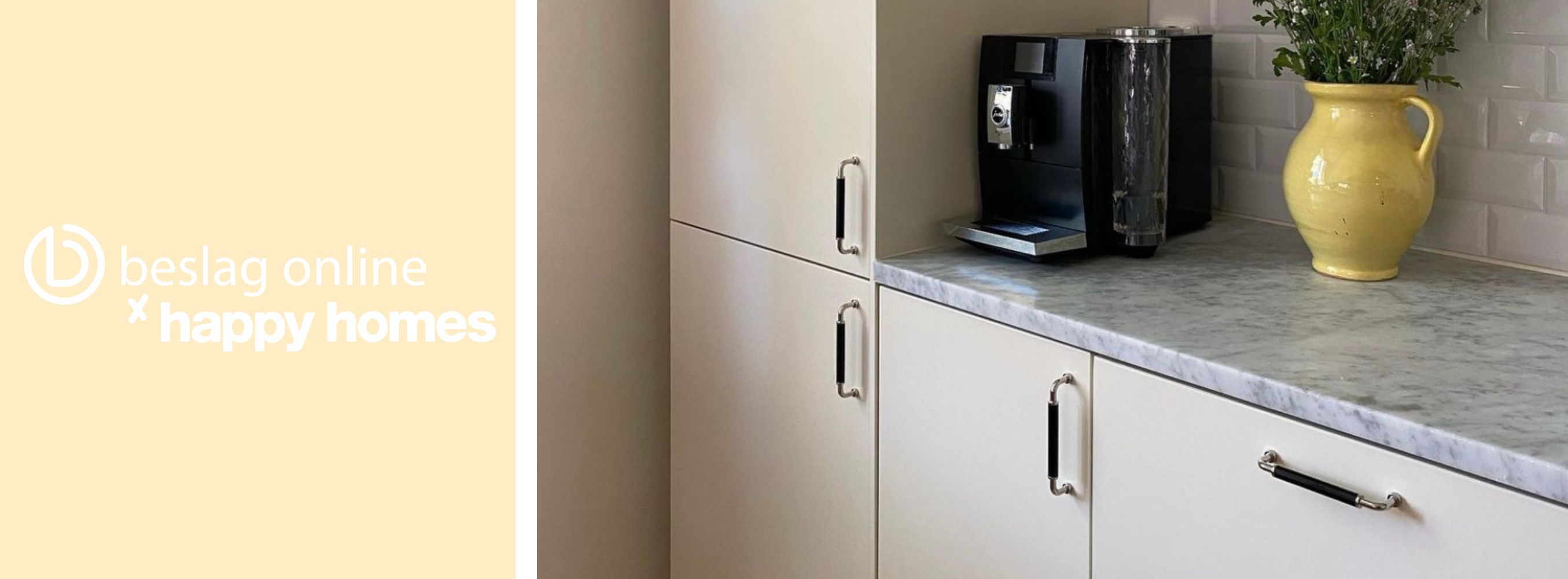 NACHHER. Was für eine Veränderung! So sieht Linns neue Küche aus. Beeindruckend, was neue Farbe und neue Griffe bewirken können. Linn entschied sich für einen hellgelben Farbton von Lycke, NCS 1005-Y20R, den sie mit unserem Griff Brohult M Vernickelt/Schwarz kombinierte.