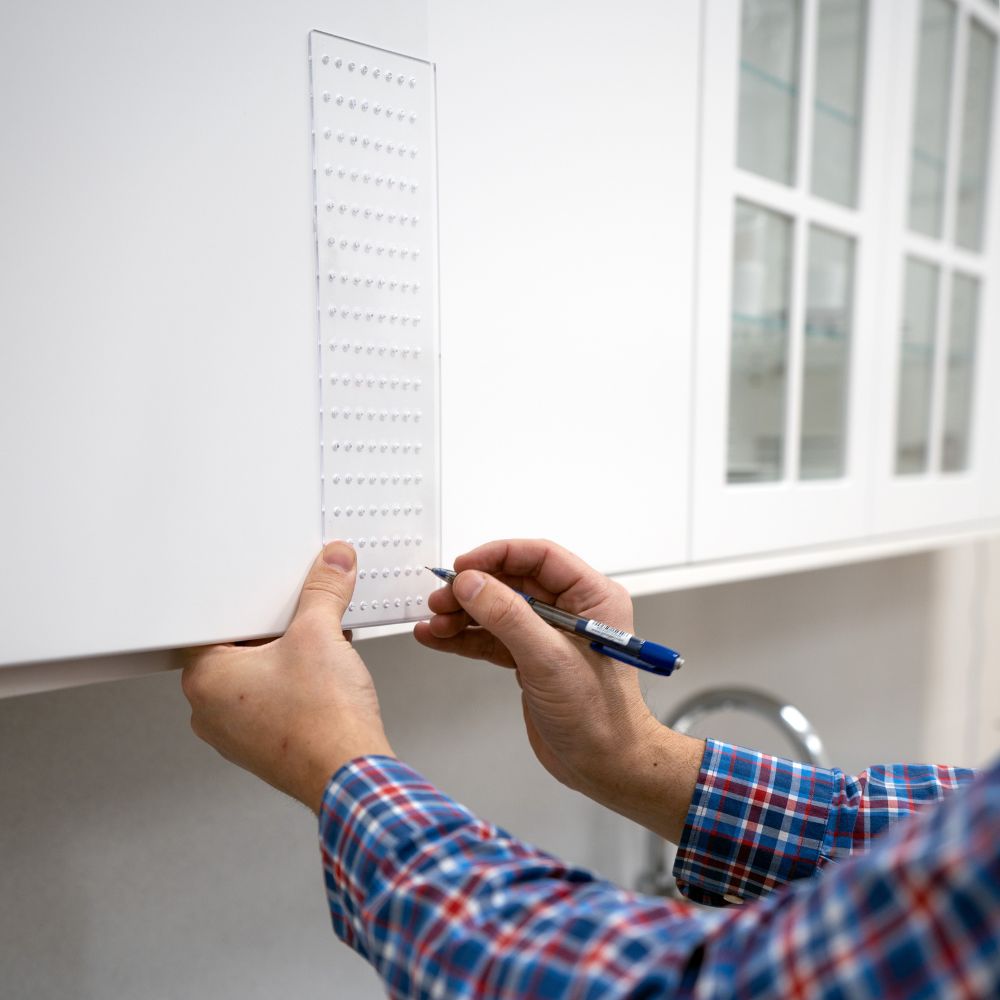 Kontrolliere anschliessend mit der Bohrschablone und gehe von der Mittelmarkierung aus, um sicherzustellen, dass die Griffleisten mittig auf der Schublade sitzen. Setze Markierungen auf der Innenseite der Schublade mit einem Nagel und einem Hammer.