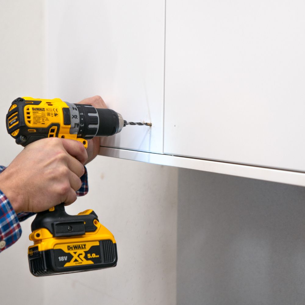 Verwende nun die Bohrmaschine mit einem passenden Bohrer, der etwas kleiner ist als die Holzschraube. Lege die Schraube probeweise an die Schublade oder Front und pruefe, dass sie nicht zu lang ist – ist sie es doch, besteht die Gefahr, dass sie durch das Material dringt und auf der Vorderseite sichtbar wird. Bohre einige Millimeter vor, damit die Holzschraube anschliessend sicheren Halt findet.