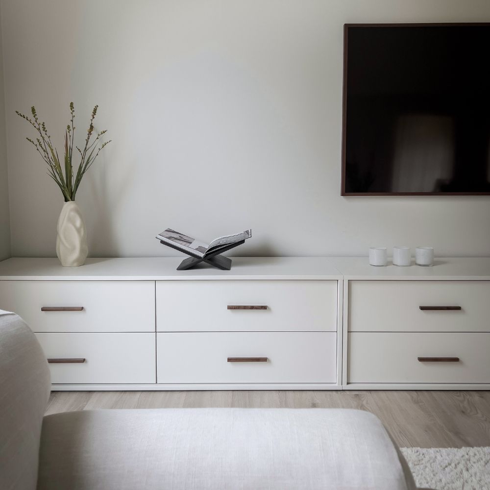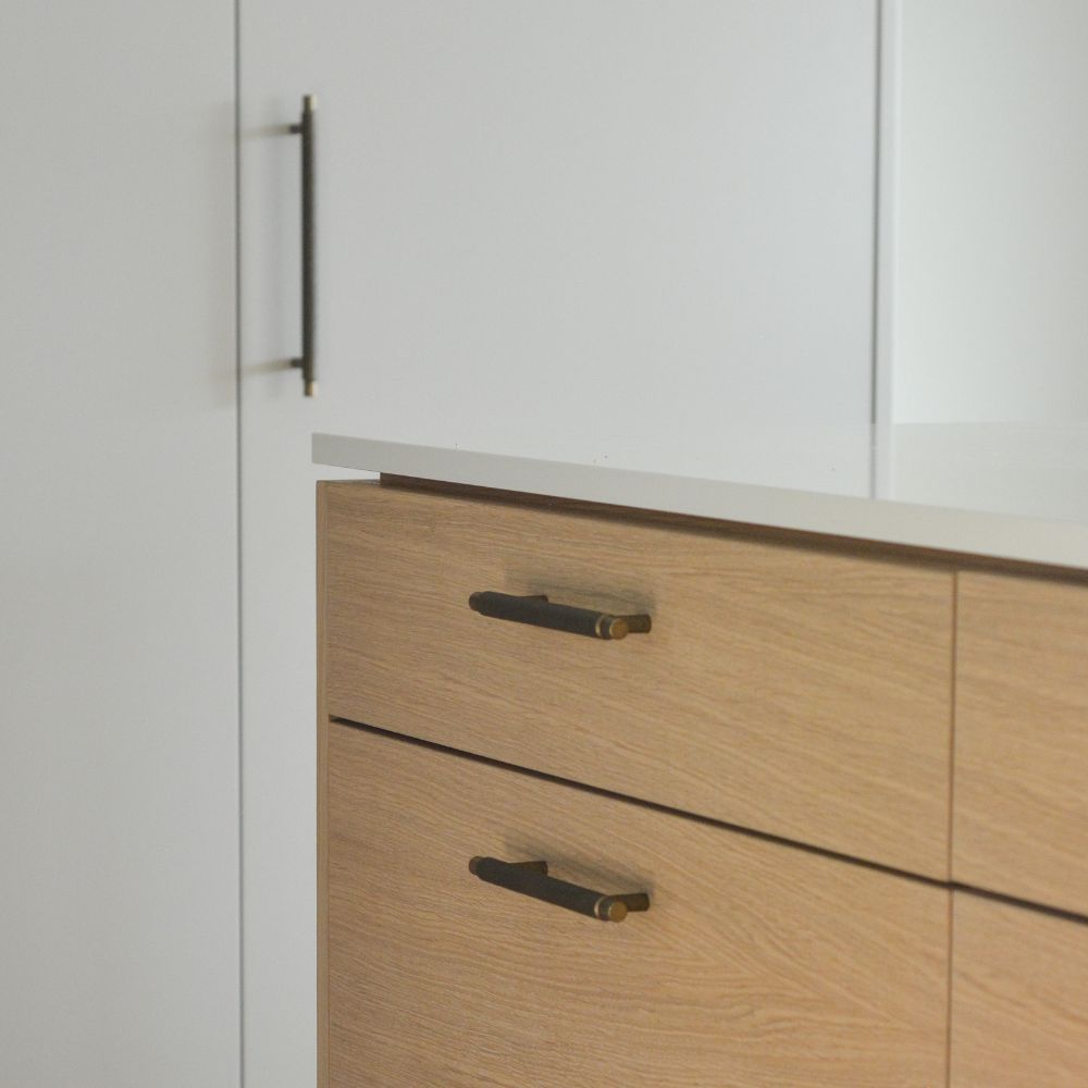 Beginne damit, die Mitte der Schublade auszumessen, setze eine kleine Markierung und nutze diese als Ausgangspunkt. Lege die Griffleiste an die Kante der Schublade und verwende die Schraubloecher der Griffleiste, um die Hoehe zu markieren, auf der sie montiert werden soll. Auch hier empfiehlt es sich, Malerklebeband zu verwenden, um saubere Bohrloecher zu erhalten und ein Ausfransen der Front zu vermeiden.